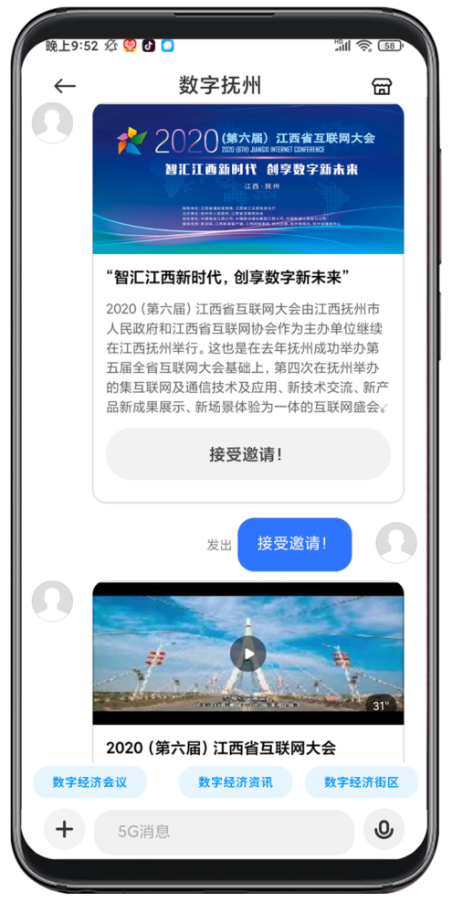 数字抚州案例5G消息场景中,结合“数字经济会议”、“数字经济资讯”、“数字经济街区”等按钮,方便市民查找对应服务,轻松查询。
