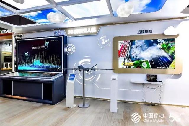 在5G网联无人机展台,中国移动通过5G蜂窝网络替代无人机的自建通信链路,实现了无人机超视距远距离控制飞行作业场景。