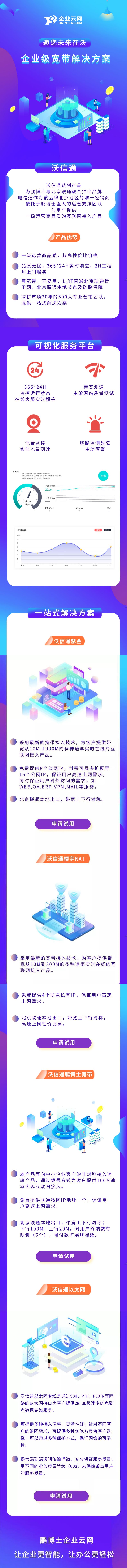 在此高要求下,鹏博士企业云网与北京联通联合推出沃信通品牌,电信通作为该品牌北京地区的唯一经销商,依托于鹏博士强大的运营支撑团队为用户提供一级运营商品质的互联网接入产品。