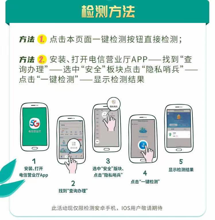 我们都需要“中国电信隐私哨兵”来保驾护航,“中国电信隐私哨兵”一键就能自动检测手机里存在的应用隐私风险,守护信息安全,关键是电信、移动、联通的用户都可以免费使用,操作简单实用。