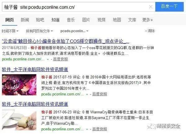 如果你想起你曾经在某些社交平台比较活跃,想删除那些黑历史怎么办?有时候也许不必回去一条条翻找,可以大概地查看下百度是否收录该信息。在百度site一下你想搜索的网站,以柚子酱自身为例,在百度:昵称+site+域名,能看到我在这个网站里面,发布过哪些页面。对百度都收录了哪些关于自己信息有兴趣的网友,不妨手动查找看看,也许又有什么令人惊喜的发现