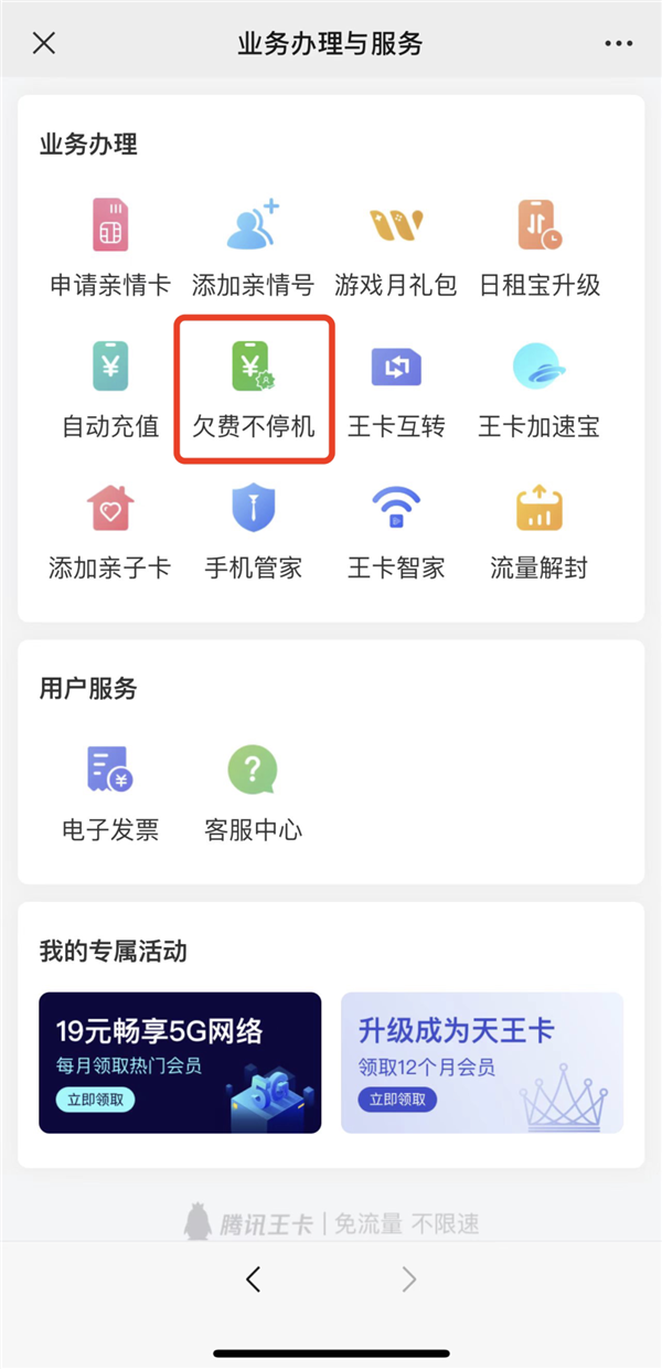 据介绍,腾讯王卡用户开通后,即可享有一定额度的欠费额度”,能够避免因月初忘缴或漏缴话费,导致手机欠费停机的情况发生。
