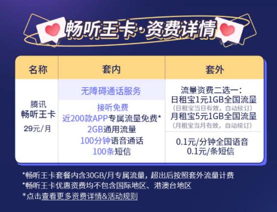 资费方面,“畅听王卡”套内含2G通用流量、100分钟语音通话、100条短信,套外,0.1元/分钟全国语音,0.1元/条短信。