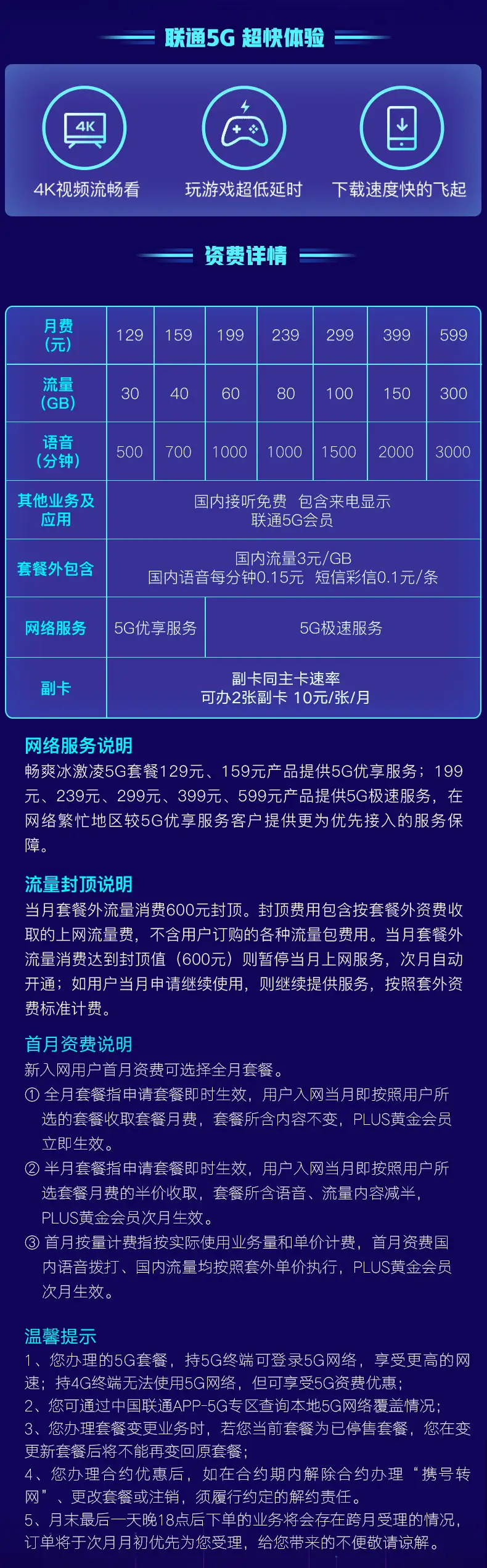 联通冰激凌129套餐:月租129元,包含30GB流量,500分钟通话时间,套外国内语音0.15元/分钟,短信0.1元/条,套外流量3元/GB