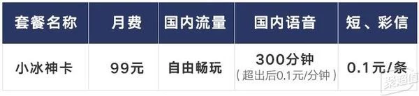 小冰神卡的月租是99元不限流量,超过20G上网速率将降至最高1Mbps,含有300分钟通话时间,适合需要通话套餐的人。