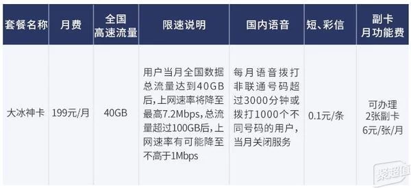 大冰神卡月租199元,可享40GB全国流量,超过的话上网速率将降至最高7.2Mbps。可办理2张副卡,6元/张/月,而且还是共享主卡里的流量的。