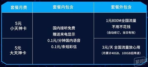 除了大小冰神卡外,还有天神卡可以选择,同样分大小天神,月租都是5元,小天神卡1元800M,大天神卡3元/天,月累计40G才降速。