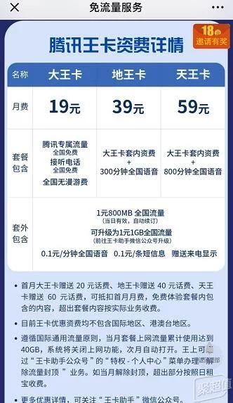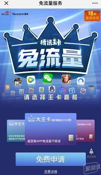 腾讯王卡一看名字就知道是腾讯软件专用流量卡,而且它除了腾讯应用免流外,还有其他合作的应用也参与免流,在微信关注“王卡助手”公众号后,可以选择申请开通。王卡有三种:大王卡、地王卡、天王卡。这也是小编最喜欢的套餐,随时可以玩绝地求生和王者荣耀,聊微信的时候也不怕狂刷表情包。