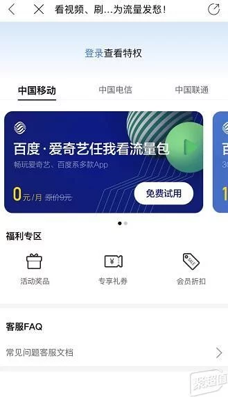 而经常使用百度应用的,例如网盘贴吧等的聚友,可以选择百度圣卡,随便打开一个百度应用,选择免流量服务,移动电信联通都有合作。流量套餐也比较多,这里阿宝就不一一介绍了,大家可以根据自己的实际需要购买~
