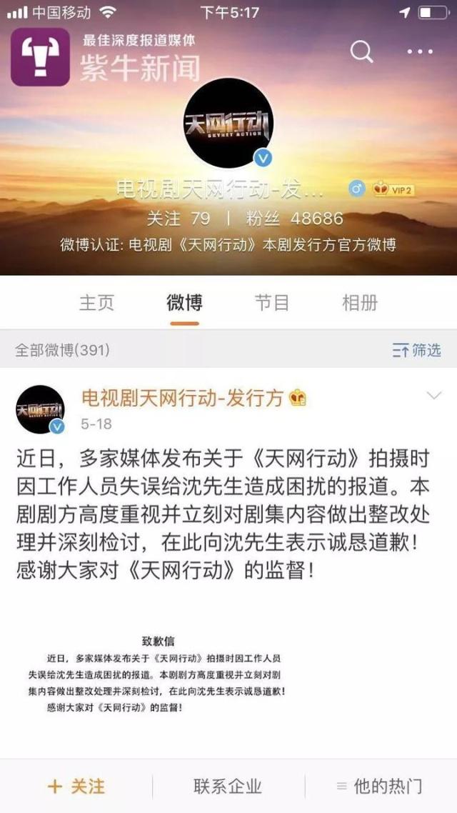 紫牛新闻记者随即在发行方官博上看到了这封致歉信:近日,多家媒体发布关于《天网行动》拍摄时因工作人员失误给沈先生造成困扰的报道。本剧剧方高度重视并立刻对剧集内容做出整改处理并深刻检讨,在此向沈先生表示诚恳道歉!感谢大家对《天网行动》的监督!在这则微博的评论里,紫牛新闻记者也看到不少网友留言:呼吁大家别“入戏太深”,别再打电话骚扰,影响沈先生的正常生活。