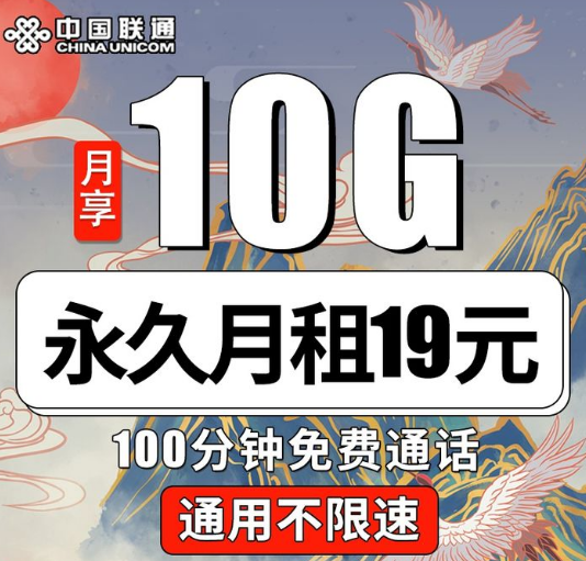 套餐介绍:每月19元月租,每月10GB全国通用流量➕100分钟国内通话,全国接听免费,不限制网速。超出1元1/GB,每年1,2,7,8月额外赠送10GB。
