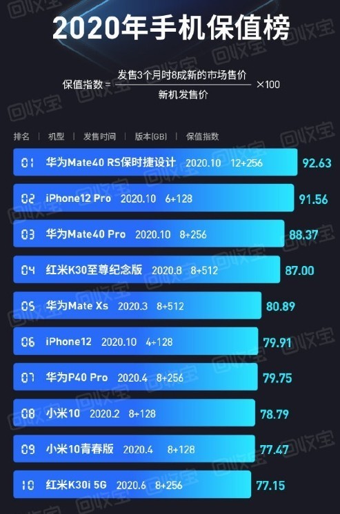 日前,手机数码回收平台回收宝发布了“手机价值指数”2020年度白皮书,在2020年手机保值榜当中,肉眼可见的机型基本都是高端产品。这不禁让网友好奇,越高端的手机就越保值吗?