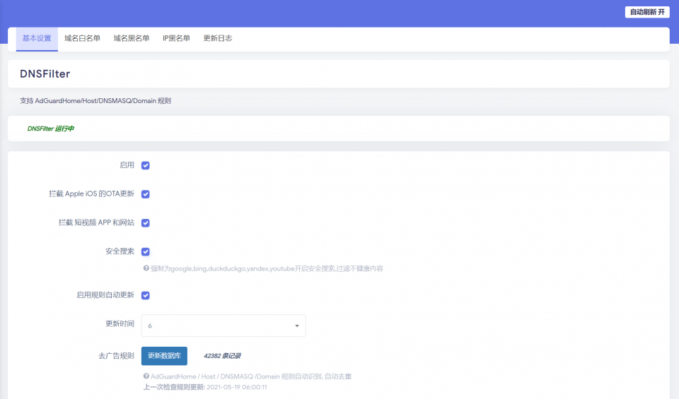 首先是“ DNSFilter ”,这是一款域名过滤插件,除了能过滤和净化网站广告,还能拦截 Apple iOS 的 OTA 更新,或者拦截短视频 APP 和网站。