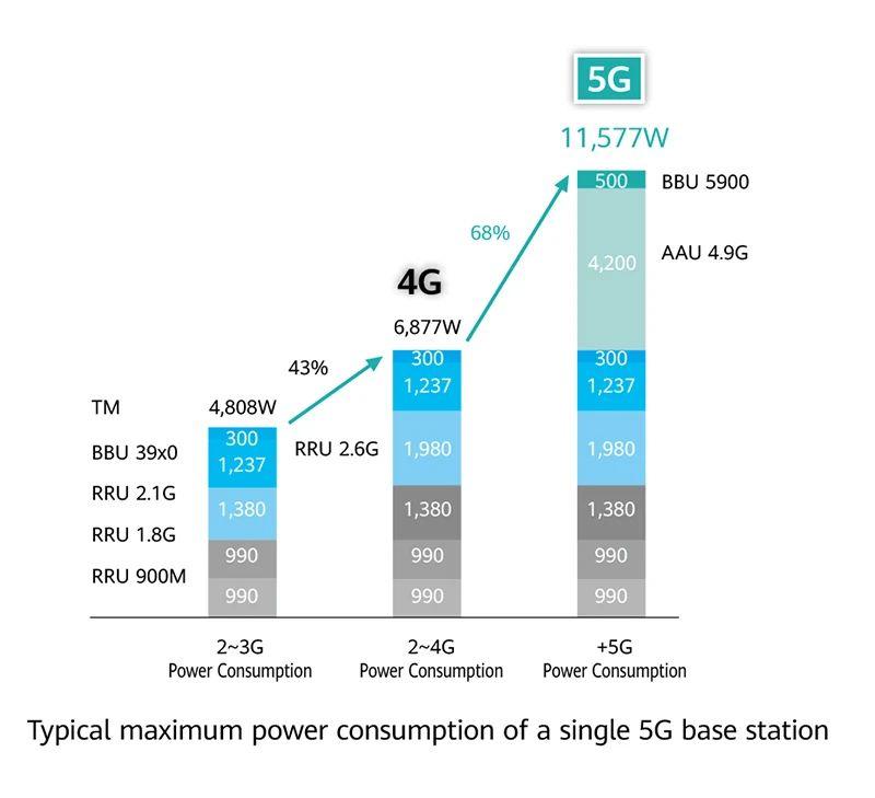 举例来说,1度电的能量消费,4G时代可传输下载300部超清电影,5G时代可传输下载5000部超清电影。