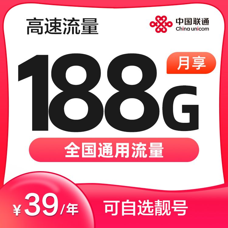 联通39元188G+100分钟 本地靓号首充100享39元188G全国通用流量+100分钟语音,有效期24个月,自动续约188GB流量丨100分钟语音大流量首充有礼正品保障¥39/月起立即申请