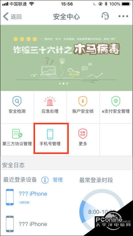 五、进入安全中心后,找到“手机号管理”一项,然后点击进入。