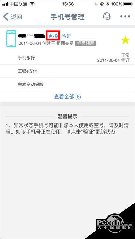 六、进入手机号管理以后,可以看到当前预留手机号,然后找到“更换”一项,然后点击进入。
