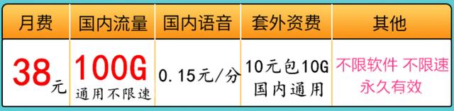 中国联通这款套餐国内语音是0.15元每分钟,这不算贵也不算便宜,目前三大运营商最贵的应该是0.19元每分钟通话,最便宜的是0.1元/分钟,当然这不包括那些免费赠送的通话。至于套餐外资费,10元包10G国内通用流量,也就是说这个套餐不是不限量套餐,38元100G国内流量,如果使用完之后需要10元购买10GB流量,但是大家可以想想,100G流量还不够你用吗?