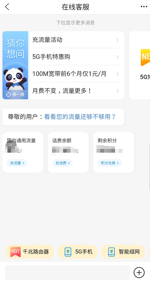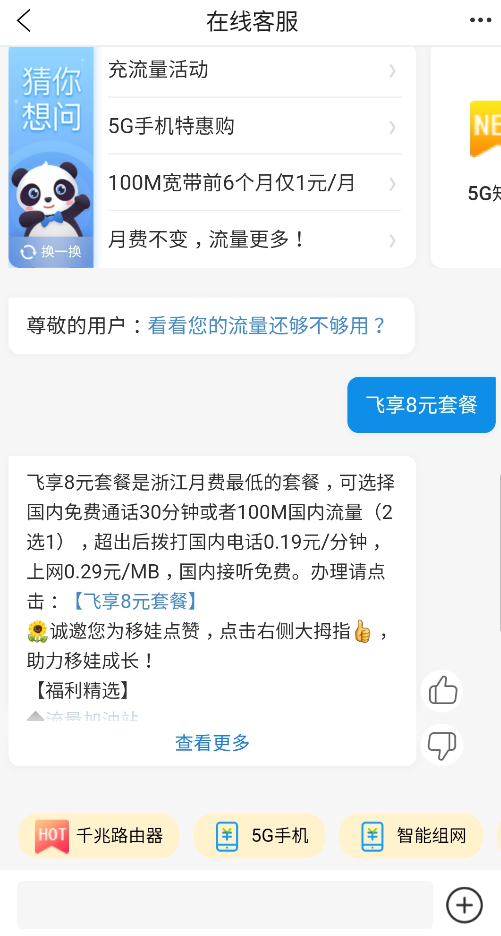 在客服页面输入“8元套餐”,马上跳出一个页面,“飞享8元套餐是浙江月费最低的套餐……”