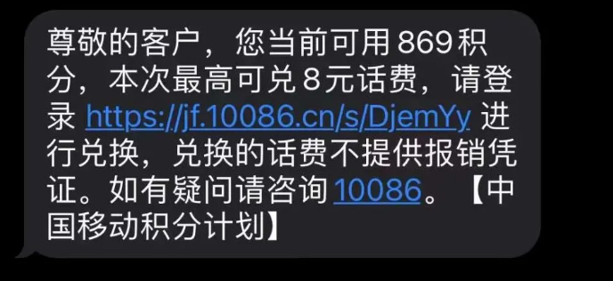 字母不区分大小写,发送后根据运营商的回复进行兑换,小编的移动号码有869 积分,可以兑换 8 元话费,你们的也赶紧去试试吧~