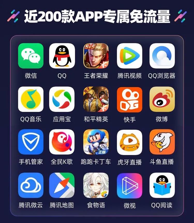二、近200款应用流量全免:腾讯旗下所有应用(QQ、微信、腾讯视频、QQ音乐、王者荣耀、和平精英、QQ浏览器、微视、腾讯地图....),全国免流量,国内流量1元=1G。