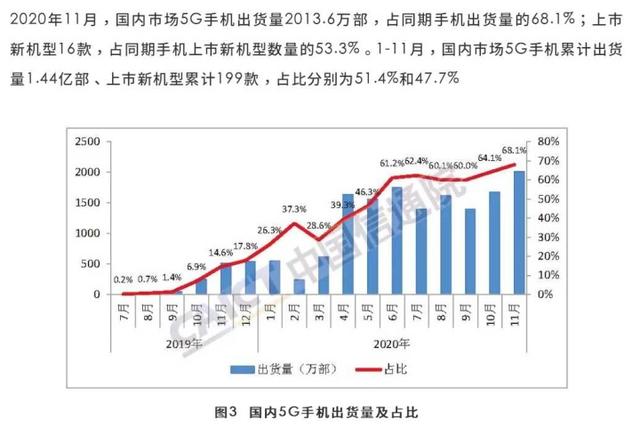 据通信院最新报告显示,今年11月国内5G手机出货量占比达68.1%,约2000万部。上市5G新机型16部,占同期上市新机数量的53.3%。