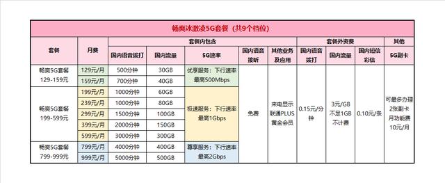 共9个档位可选,最低500分钟+30GB起步129、159元享受5G优享速率,199-599元可享5G极速速率,799元起以上享受5G尊享速率接听免费,送来电显示拨打0.15元/分钟短彩信0.1元/条套外流量3元/GB,不满1GB不收费比如:套外流量用了1.8G,不满2G,所以收费是3元。