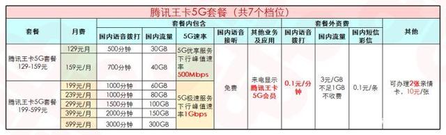 共7个档位可选,最低500分钟+30GB起步129、159元享受5G优享速率,199元起可享5G极速速率接听免费,送来电显示拨打0.1元/分钟短彩信0.1元/条套外流量3元/GB,不满1GB不收费目前联通用户允许转入的腾讯王卡5G版共7个档位。