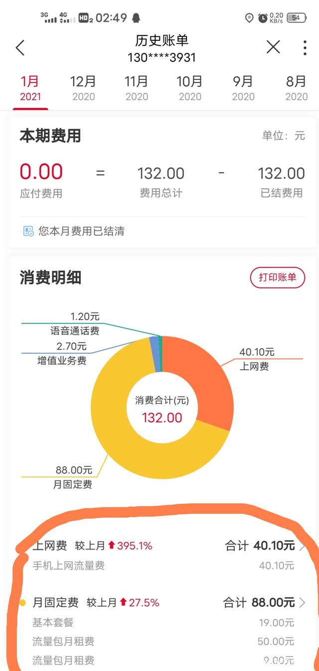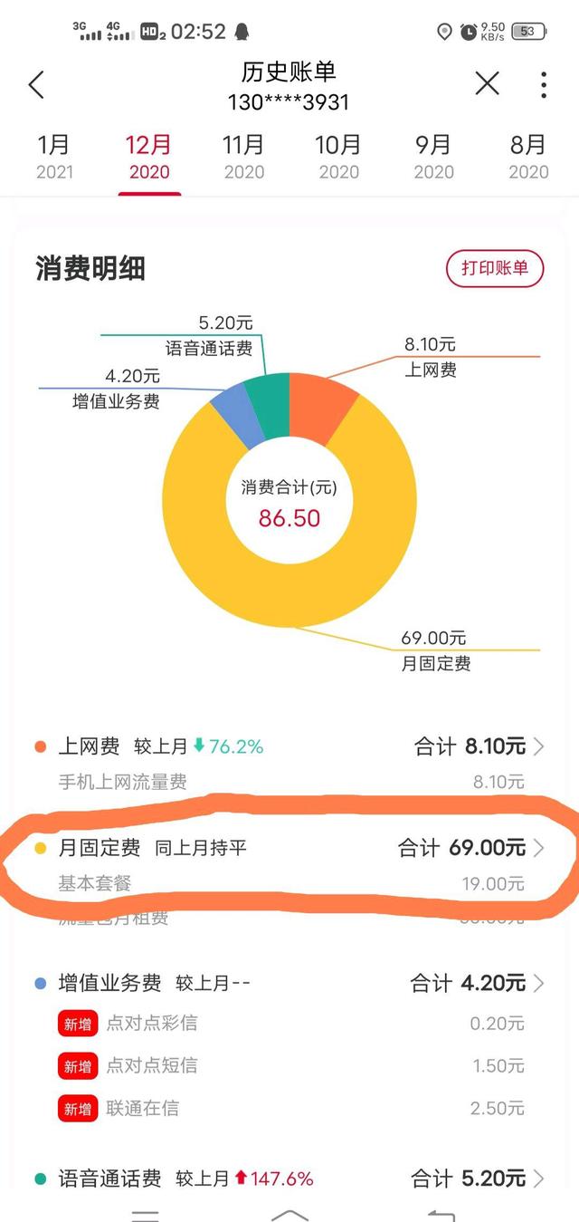 联通app里面账单显示自2020年以来每个月消费均达80元以上,每月账单各种小额业务胡乱一通(除了38元流量包小编并没有办理过其他业务),月固定费更是一个月比一个月高,刚开始办卡的时候月固定费是一个月6元,但查账单显示自2020年起,月固定费一直在不断增加,直到现在一个月88元!