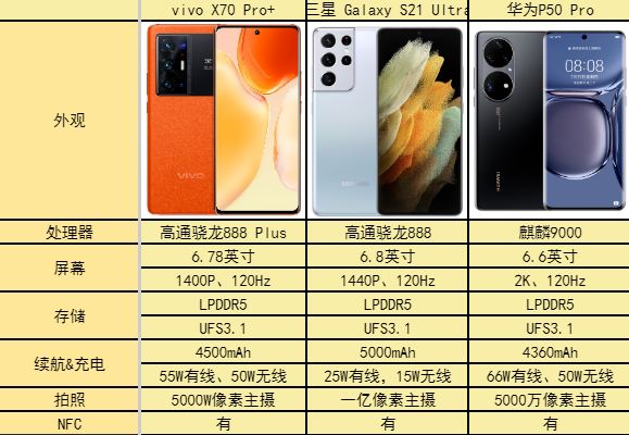 商务人士对手机有着更加特别的要求,他们注重手机的续航能力,外观设计,商务功能等。因此,我就为大家推荐三台大气上档次旗舰手机,不仅是商务人士必备利器,更能成为商务人士的左肩右膀,它们分别是vivo X70 Pro+、三星Galaxy S21 Ultra 5G、华为P50 Pro,首先来看主要参数表。
