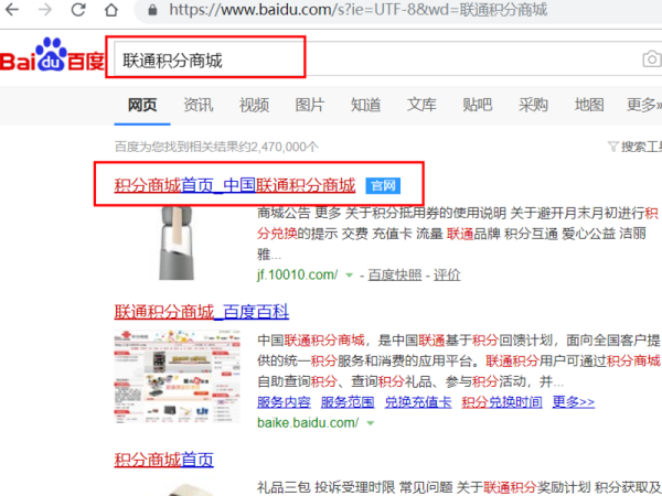 2、在搜索框中输入【联通积分商城】,输入完成后会显示搜索结果,点击进入下面的积分商城官网。