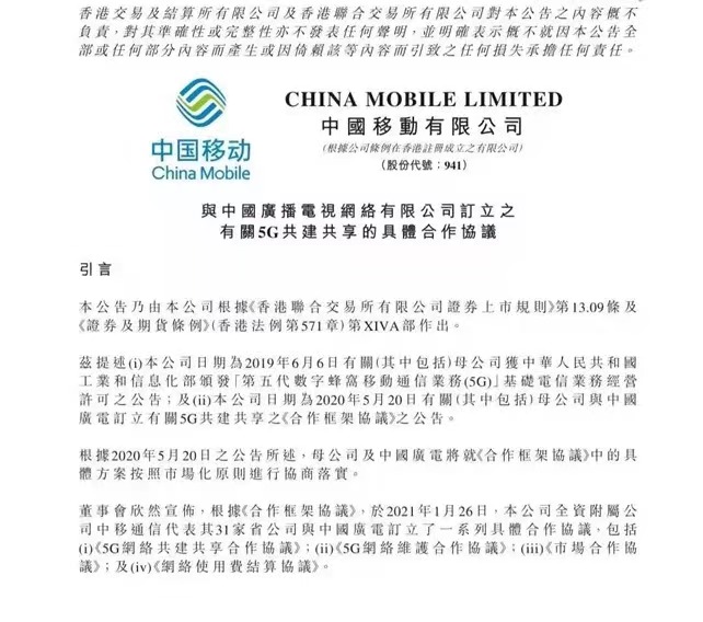 1月26日,中国移动还发布了一条消息:中国移动与中国广电在北京签署 “5G战略”合作协议,正式启动700MHz5G网络共建共享。