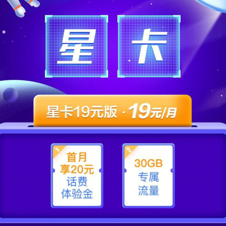 星卡套餐月基本费19元,包含30GB爱奇艺、腾讯视频、优酷视频、西瓜视频、抖音短视频、抖音火山版、快手、网易云音乐等定向流量免费。国内接听免费,赠送来电显示和189邮箱,超出资费:国内流量:按1元1GB/日,流量当日有效,自动续订,不用不收费,当日流量不可结转次日使用,国内通话:0.1元/分钟,国内短/彩信:0.1元/条。