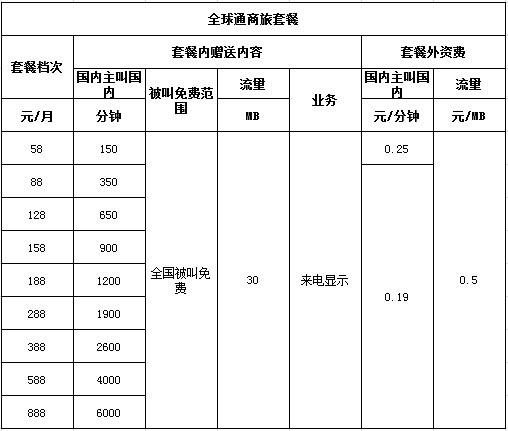 中国移动4g套餐价格表商旅套餐资费内容