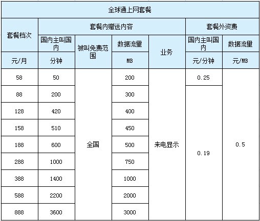 全球通上网套餐同样分为从58元每月月费的套餐一直到888元套餐九个等级,套餐内所包含赠送的国内数据流量分别从最低的200M到最高的3000M不等;通话时间从最低的50分钟到3600分钟不等,同样支持国内范围接听免费,套餐外资费支持长话话费漫游统一价格。