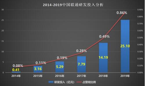 近年来中国联通的研发投入不断增加,2014年公司研发投入只有0.41亿元,占到营业收入的0.08%;2019年研发投入已经达到25.10亿元,占到营业收入的0.86%,复合增长率高达60%。