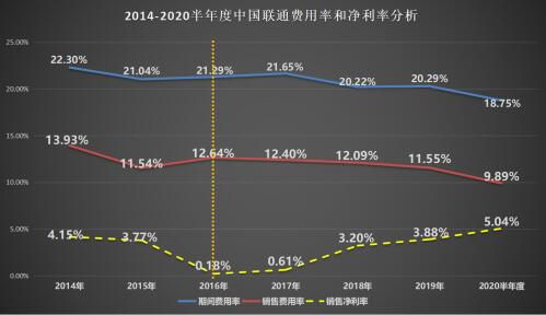 2014-2020半年度中国联通的期间费用率分别为22.30%、21.04%、21.29%、21.65%、20.22%、20.29%、18.75%,2017年开始公司的期间费用率持续下降,主要是因为公司对销售费用率进行了控制,销售费用率从2017年的12.64%下降到了现在的9.89%。在费用控制的影响下,中国联通的销售净利率持续增长,从2016年的0.18%涨到了2020年的5.04%,增长了5个百分点,公司费用控制成效显著。