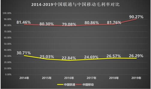 压低价格策略使得中国联通的毛利率一直处于低位,2014-2019年中国联通的毛利率分别为30.71%、25.03%、22.84%、24.69%、26.57%、26.29%。公司毛利率近几年不足30%,且有下滑趋势;相反,中国移动的毛利率持续增长,2019年已达到90.27%,差距进一步拉大。
