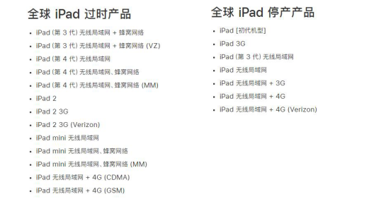 首先,你手上的iPad型号不属于过时产品或停产产品。过时产品是指已经停止销售5年以上7年以下的产品,如果你的iPad型号是下图的某一款,就不能申请服务: