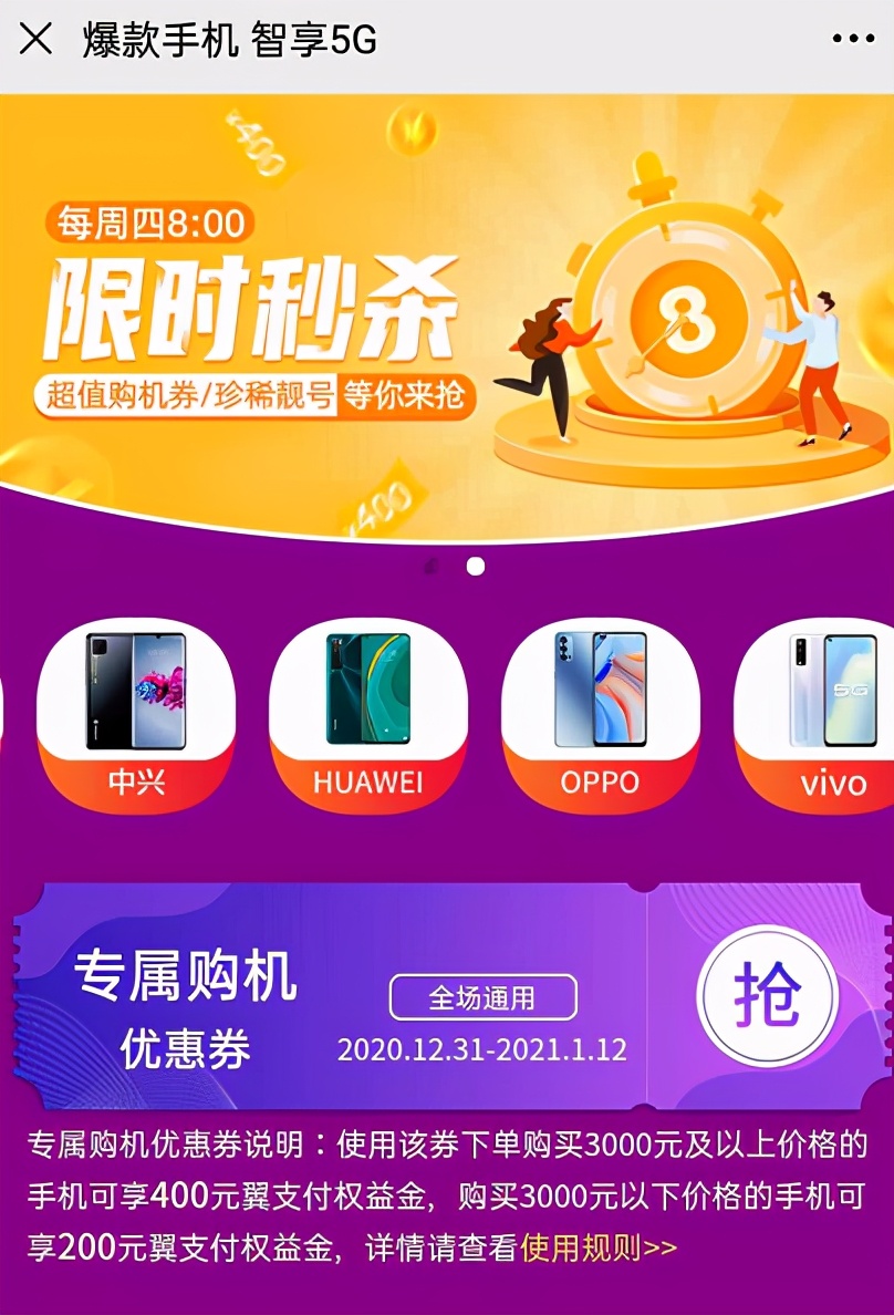 安徽电信对用户发放国产5G手机购机补贴,关注安徽电信公众号回复5G手机即可领取