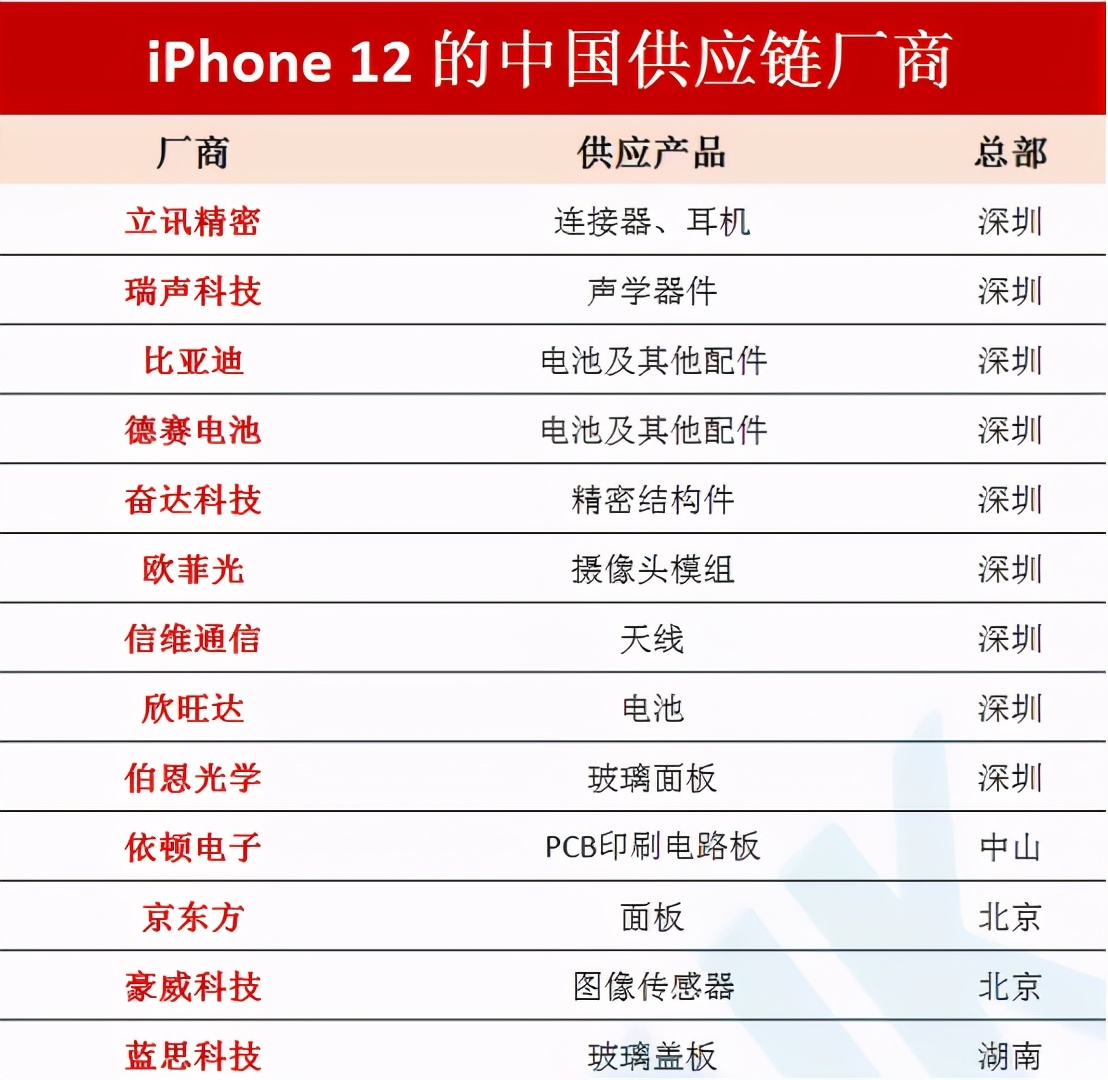 就拿iPhone 12来说,在这一部小小的手机上,就有来自立讯精密、比亚迪、欧菲光、京东方等等国内优秀厂商自主生产的各类零部件,我们不再只是组网,而是真正的研发制造和供应。