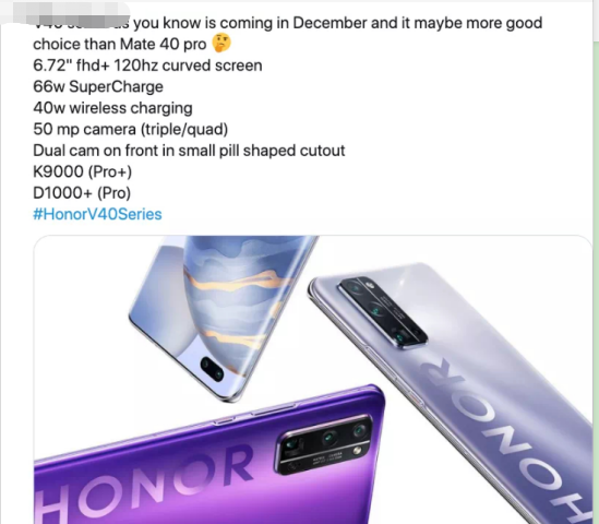 从爆料来看该系列里可能只有荣耀V40 Pro+搭载了麒麟9000处理器,而V40和V40 Pro版本可能搭载天玑1000+处理器。
