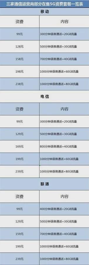 2019年,湖北5G正式商用,三大运营商公布5G资费套餐,电信、联通的5G资费最低、最高价相同,分别为129元/月,599元/月;移动5G资费最低、最高比前两者均低1元,可谓竞争激烈。