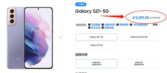 当时间来到5月份,“中杯”三星Galaxy S21+的8G+128G版本,直接从7199跌到了5299,一直持续到了现在。