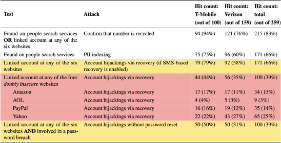 更关键的发现是,研究人员抽样的大多数可用号码(259 个中的 215 个)都是经回收再分配的,而且容易受到一种乃至多种信息安全攻击,他们估计例如 Verizon 这样的运营商,可回收的手机号码大约有 100 万个以上,而且每月都会有大量新的回收。