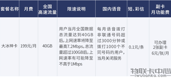 大冰神卡月租199元,可享40GB全国流量,超过的话上网速率将降至最高7.2Mbps。可办理2张副卡,6元/张/月,而且还是共享主卡里的流量的。