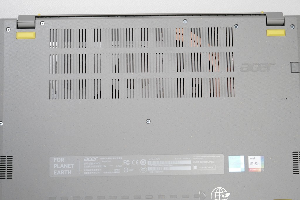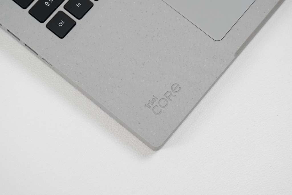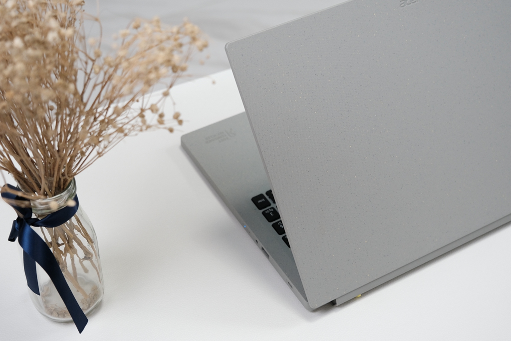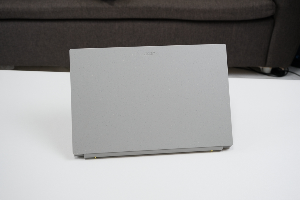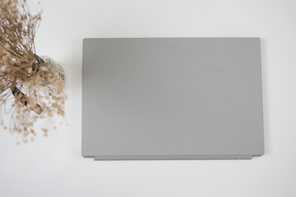 这么说,我觉得Acer蜂鸟·未来环保版长得很好看,整体是有一些星空灰配色加黄色圆点的点缀。关键是,整体的纹理感也很细腻,触摸起来和金属面板的差异很大,有一种类磨砂的触感,我个人还是蛮喜欢的。