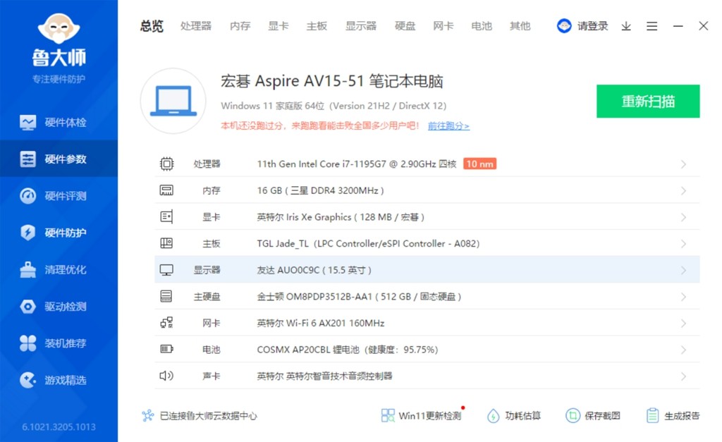 打开测试软件,大家就可以看到它的配置规格了。内置的是i7-1195G7处理器,睿频为5.0GHz,单核性能超过桌面处理器,而且这颗处理器内置的是Intel Iris Xe Graphics eligible核显,运行网游LOL,轻度PR视频还是可以胜任的。