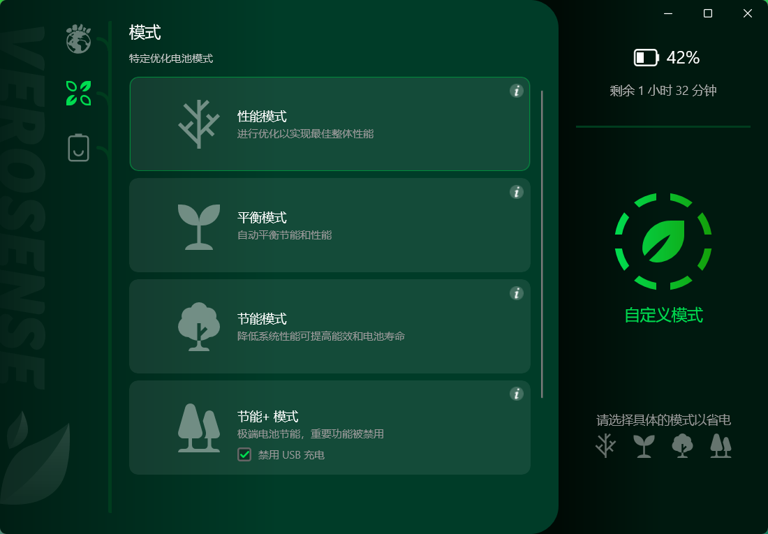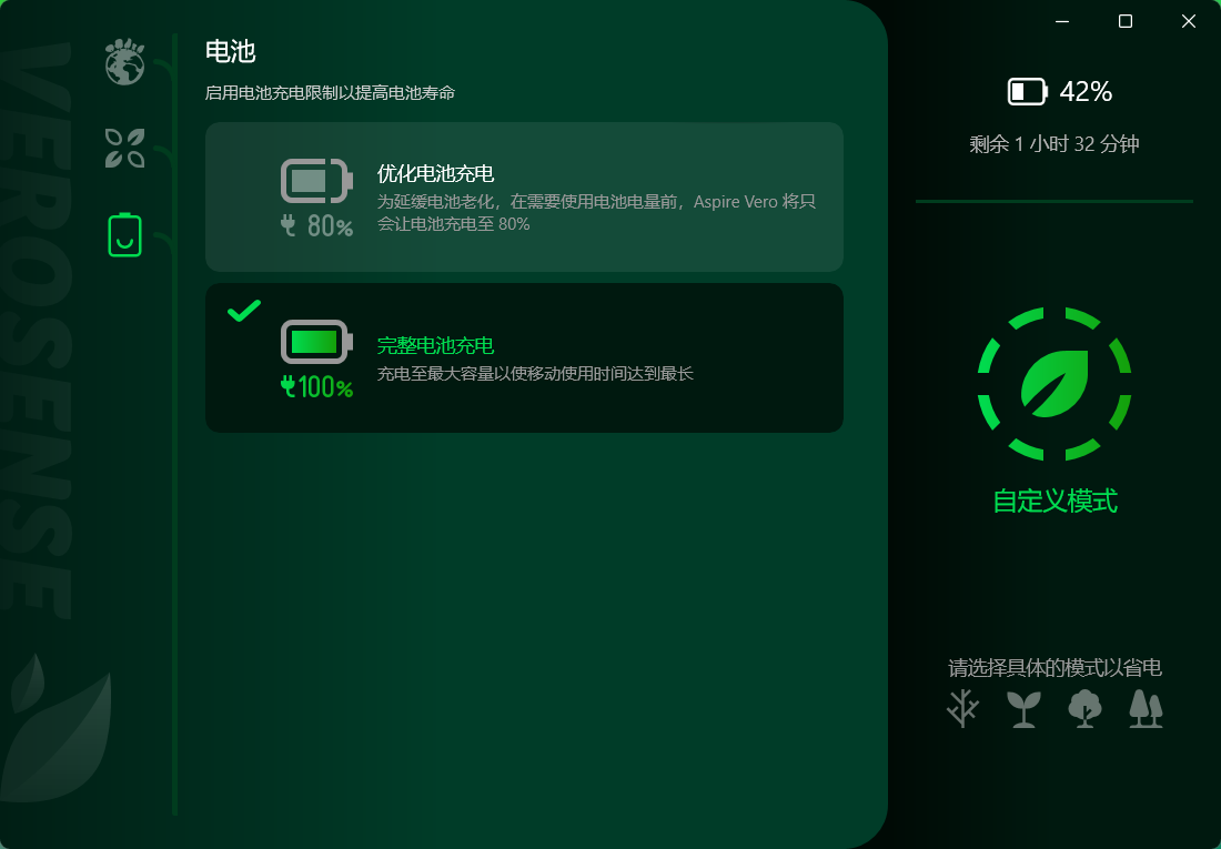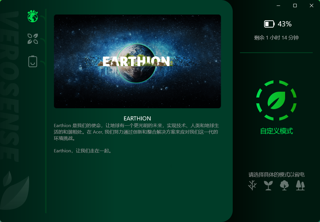 VeroSense系统也是Acer宏碁开发的一个“环保系统”。在VeroSense系统中可以开启极速模式(最佳性能状态)、平衡模式(平衡功耗与性能)、生态模式(降低性能 提高效率与电池寿命)、以及生态+模式(极度节省)。