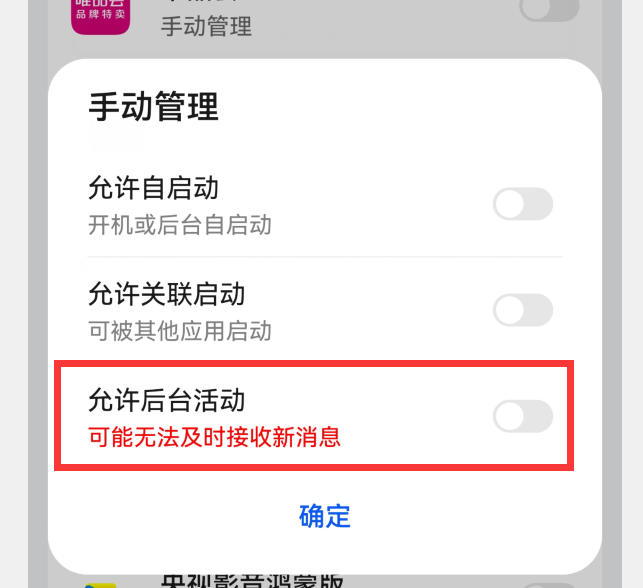 点击“允许后台活动”右侧的开关,把它变成蓝色,就可以了。以后微信就算关闭了,也会在后台运行。